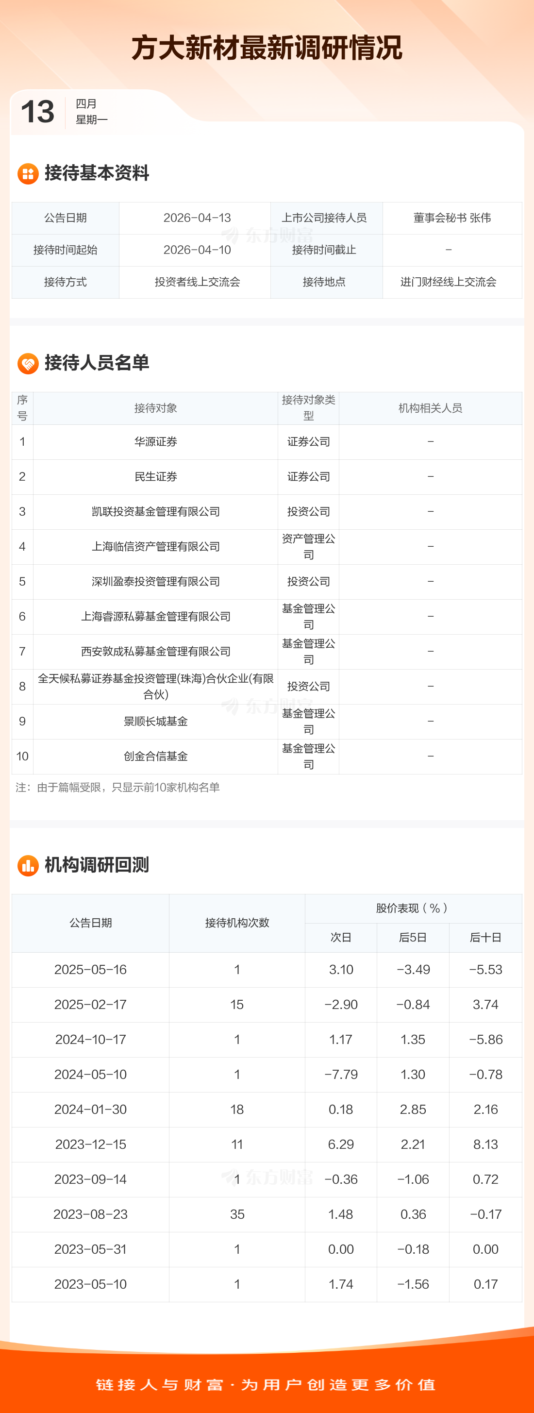 方大新材4月13日公告称,4月10日接待华源证券等16家机构调研。接待人员包括董事会秘书 张伟。