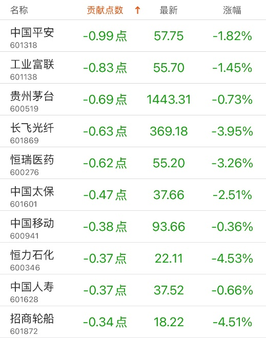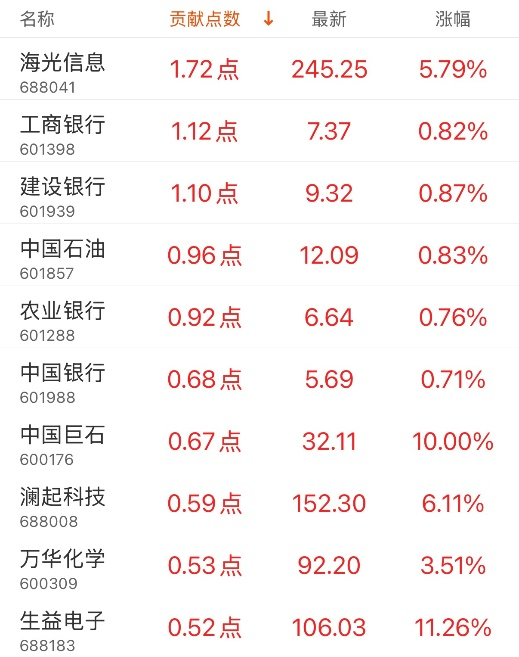 对上证指数贡献点数最多的个股是海光信息,贡献1.72点,该股当日涨5.79%,收盘价245.25元;拖累点数最多的个股是中国平安,拖累0.99点,该股当日跌1.82%,收盘价57.75元。