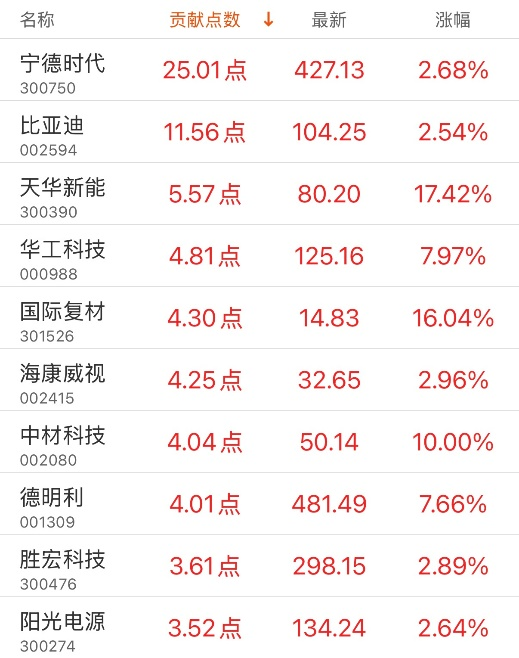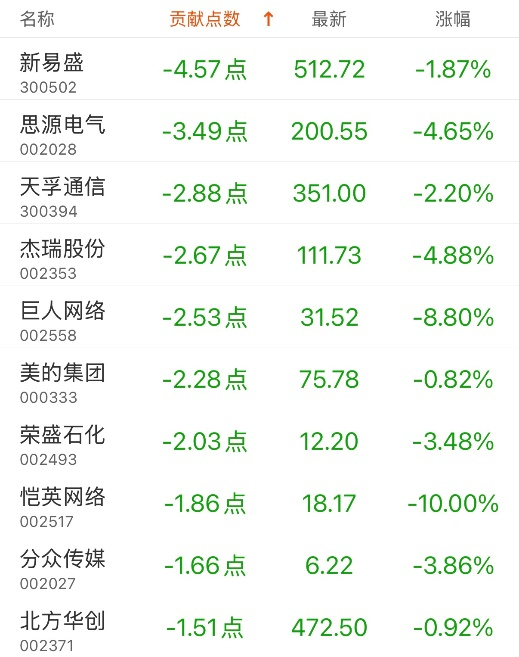 对深证成指贡献点数最多的个股是宁德时代,贡献25.01点,该股当日涨2.68%,收盘价427.13元;拖累点数最多的个股是新易盛,拖累4.57点,该股当日跌1.87%,收盘价512.72元。