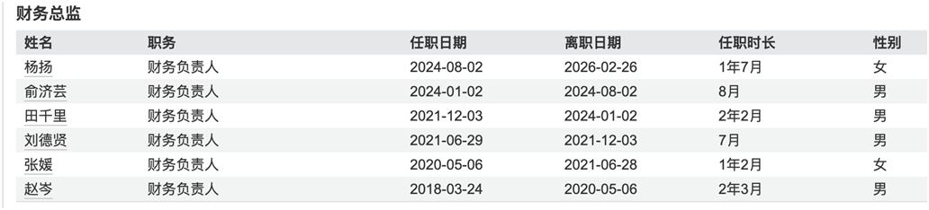 杨扬任职财务负责人1年7个月,在杨扬之前,原公司财务负责人俞济芸任职时间8个月、田千里任职2年2个月,刘德贤任职7个月。