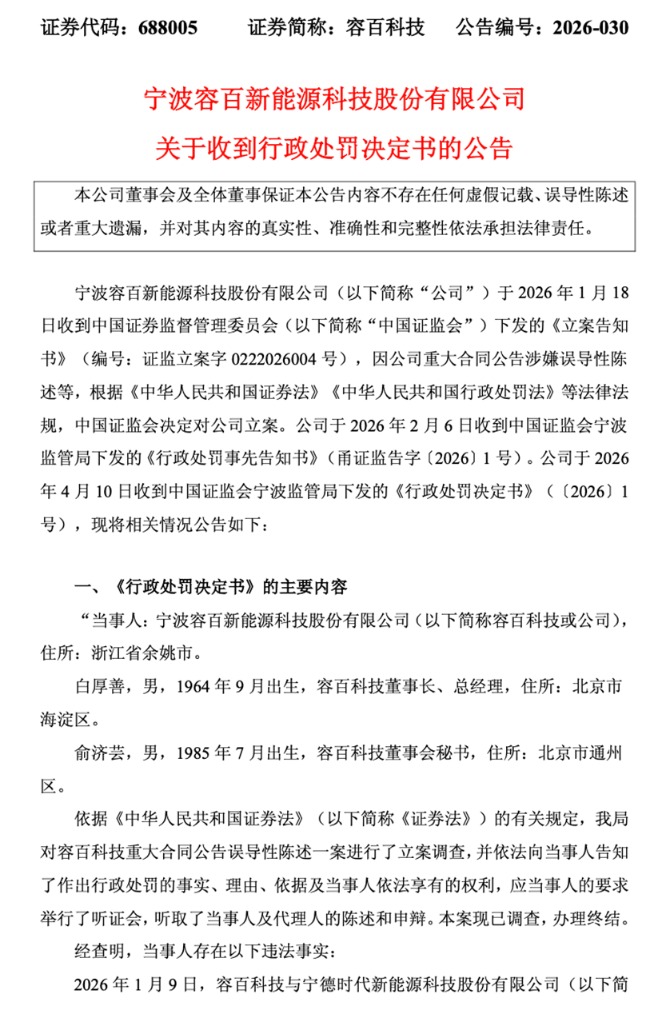 2026年4月10日,宁波容百新能源科技股份有限公司(688005.SH)披露了宁波证监局开出的950万元罚单。与此同时,公司也发布了上市以来首次年度亏损的2025年财报。
