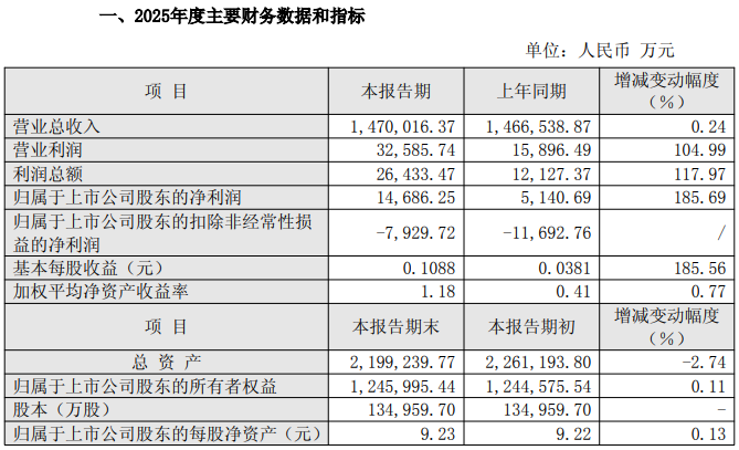 4月13日,新安股份(600596.SH)发布2025年度业绩快报。2025年度,公司实现营业收入147.00亿元,同比增长0.24%;实现归母净利润1.47亿元,同比增长185.69%;扣非净利润-7929.72万元,上年这一数据为-1.17亿元。