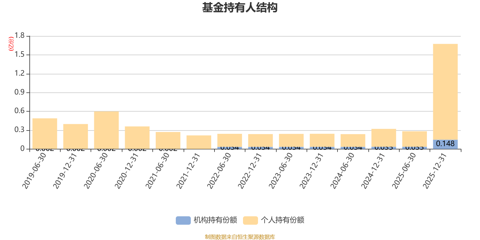 截至2025年12月31日,基金持有人共计1.43万户,合计持有1.67亿份。其中管理人员工持有30.72万份,占比0.18%,机构持有份额占比8.82%,个人投资者占比91.18%。