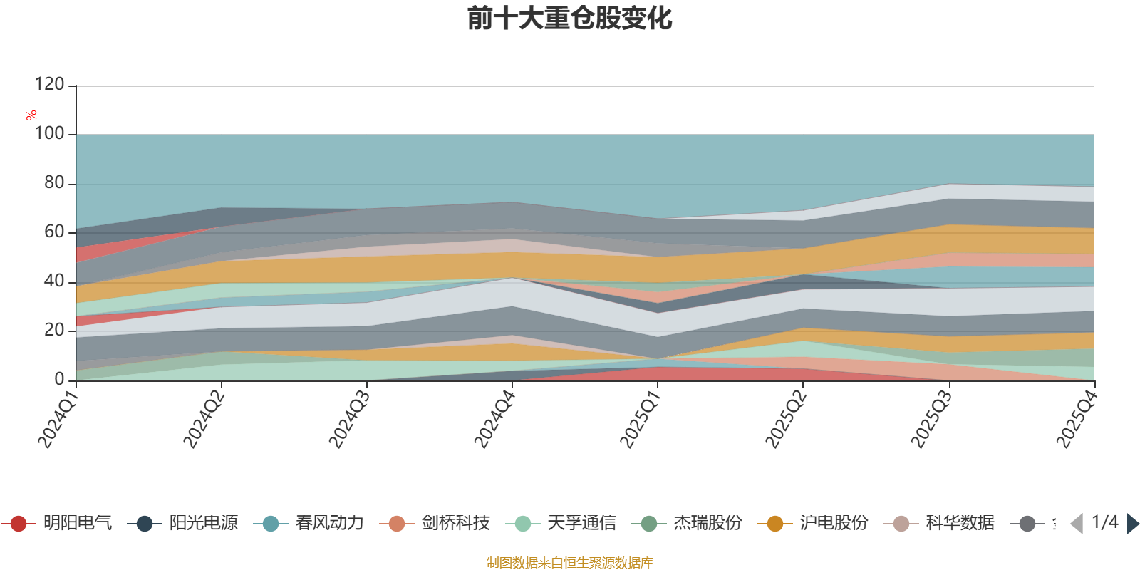 该基金持股集中度较高,近2年前十大重仓股集中度长期超过60%。截至2025年末,基金十大重仓股分别是中际旭创、新易盛、宁德时代、新产业、工业富联、杰瑞股份、沪电股份、生益科技、天孚通信、亿纬锂能。