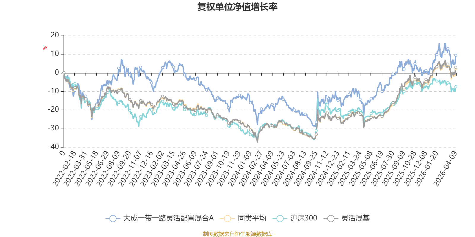 截至4月9日,大成一带一路灵活配置混合A近三个月复权单位净值增长率为3.28%,位于同类可比基金261/1287;近半年复权单位净值增长率为2.63%,位于同类可比基金558/1286;近一年复权单位净值增长率为36.53%,位于同类可比基金535/1286;近三年复权单位净值增长率为3.97%,位于同类可比基金873/1286。
