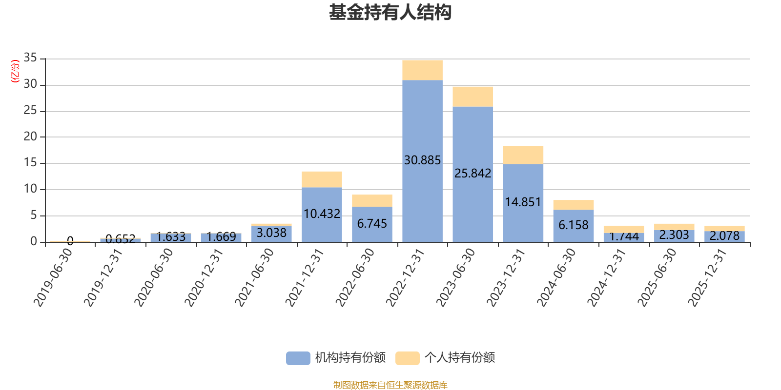 截至2025年12月31日,基金持有人共计2.8万户,合计持有3.07亿份。其中管理人员工持有3.52万份,占比0.01%,机构持有份额占比67.63%,个人投资者占比32.37%。
