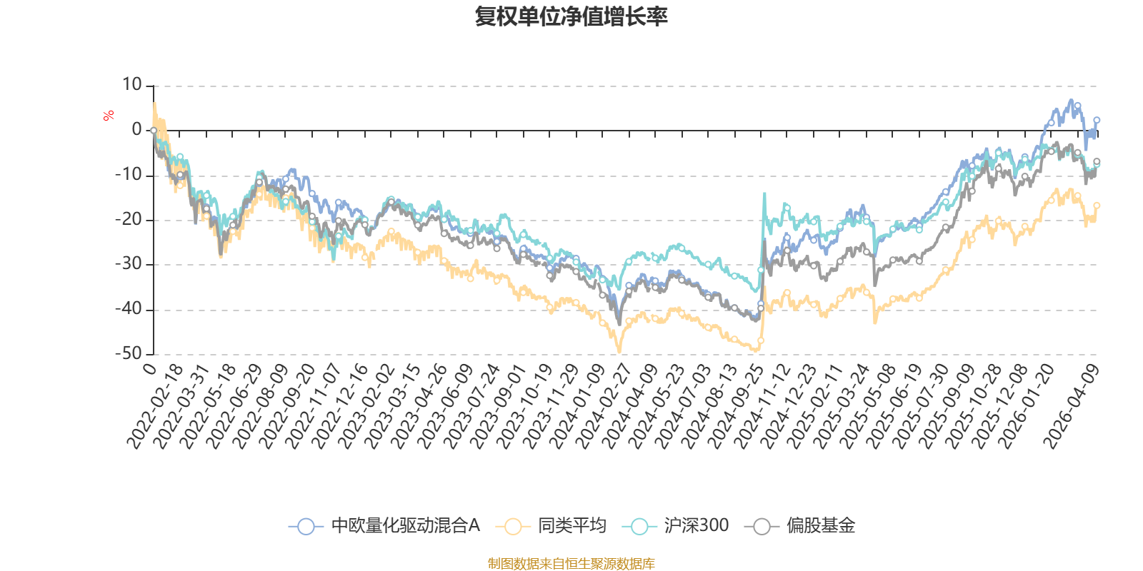 截至4月9日,中欧量化驱动混合A近三个月复权单位净值增长率为2.26%,位于同类可比基金182/621;近半年复权单位净值增长率为6.46%,位于同类可比基金166/621;近一年复权单位净值增长率为39.02%,位于同类可比基金301/618;近三年复权单位净值增长率为23.10%,位于同类可比基金227/559。
