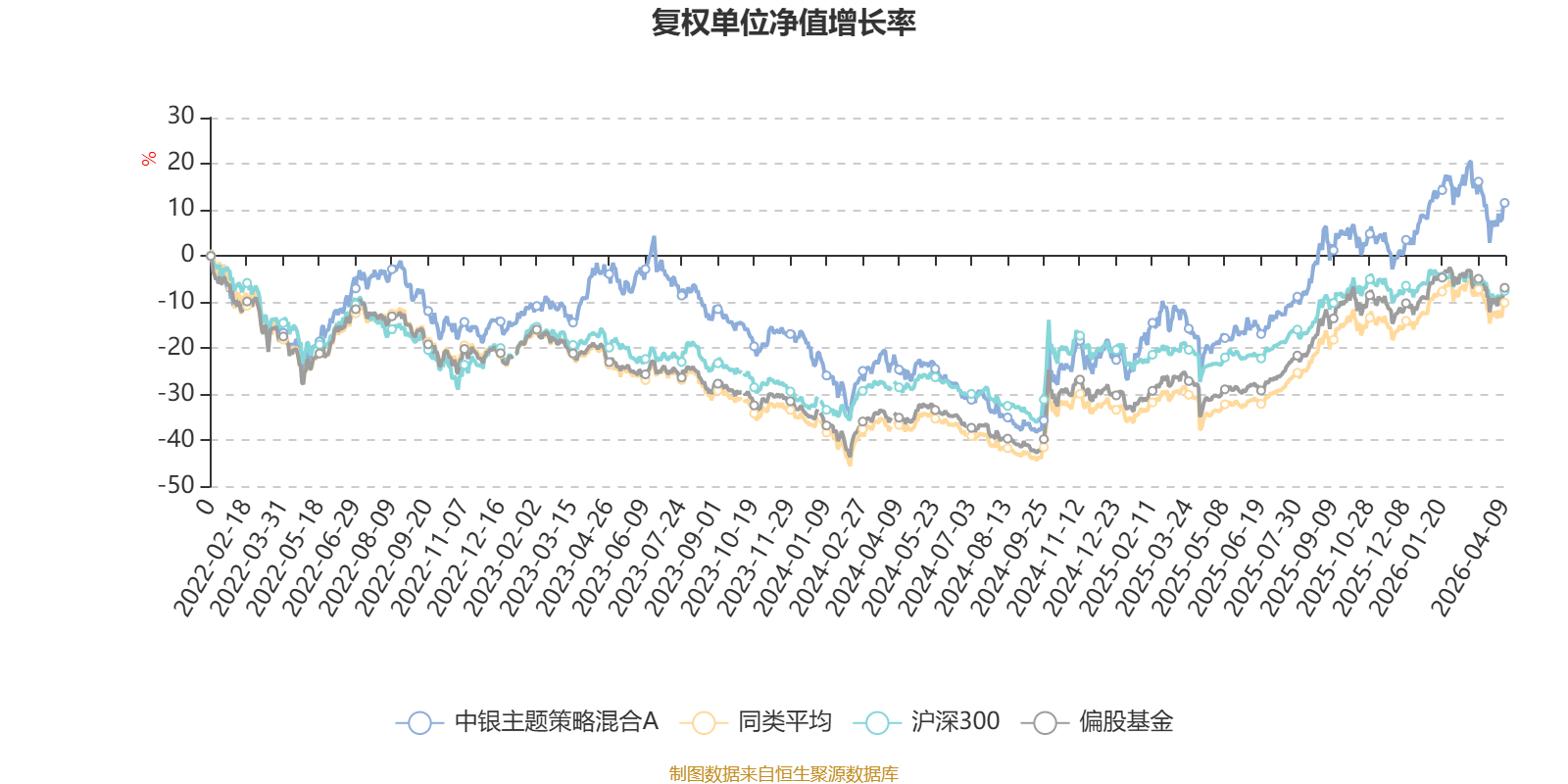 截至4月9日,中银主题策略混合A近三个月复权单位净值增长率为-1.71%,位于同类可比基金85/185;近半年复权单位净值增长率为4.36%,位于同类可比基金62/185;近一年复权单位净值增长率为44.90%,位于同类可比基金74/185;近三年复权单位净值增长率为14.50%,位于同类可比基金93/177。