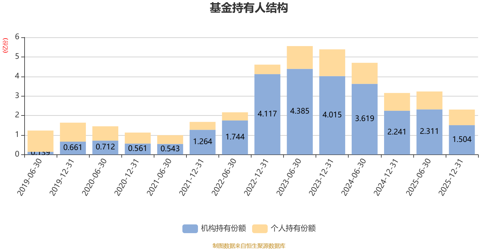 截至2025年12月31日,基金持有人共计30.04万户,合计持有2.3亿份。其中管理人员工持有336.9万份,占比1.46%,机构持有份额占比65.31%,个人投资者占比34.69%。