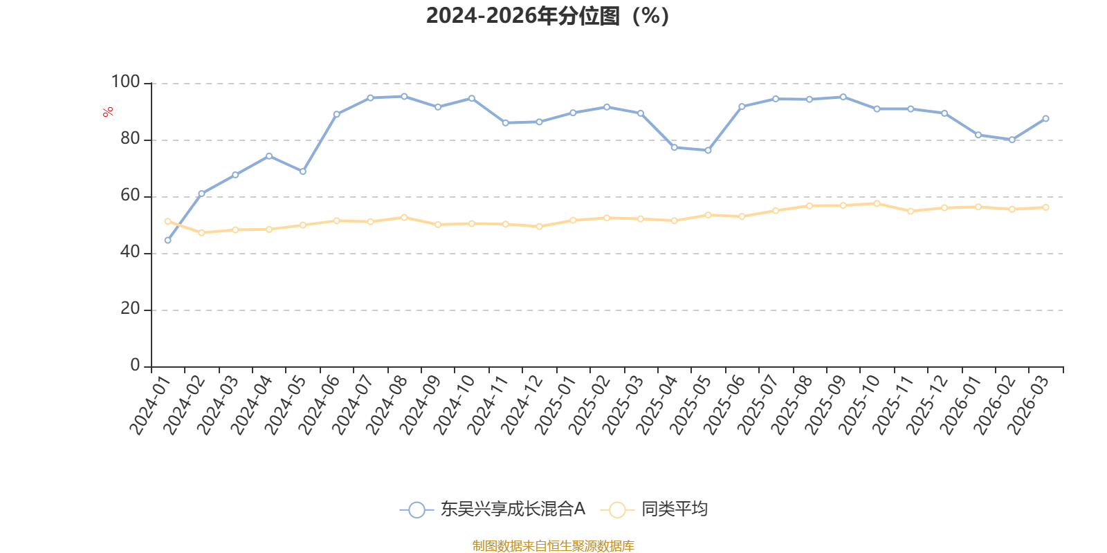 通过所选区间该基金净值增长率分位图,可以观察该基金与同类基金业绩比较情况。图为坐标原点到区间内某时点的净值增长率在同类基金中的分位数。