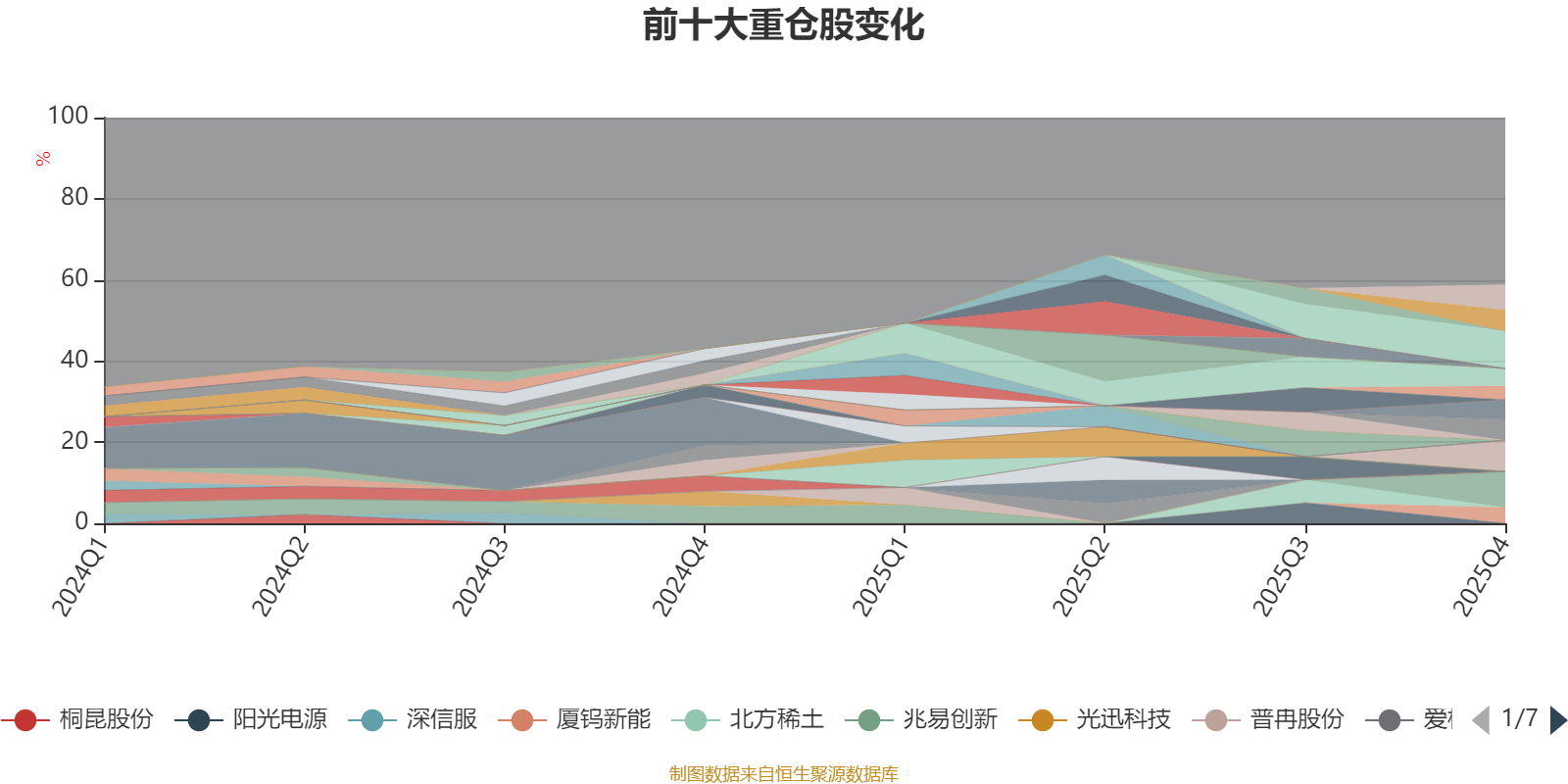 截至2025年末,基金十大重仓股分别是恒瑞医药、兆易创新、寒武纪、中芯国际、中国人寿、海博思创、中矿资源、三花智控、厦钨新能、康龙化成。