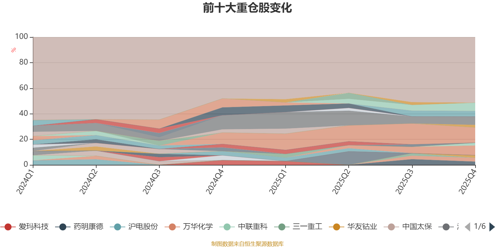 截至2025年末,基金十大重仓股分别是贵州茅台、中国平安、招商银行、紫金矿业、恒瑞医药、万华化学、药明康德、海光信息、生益科技、华友钴业。