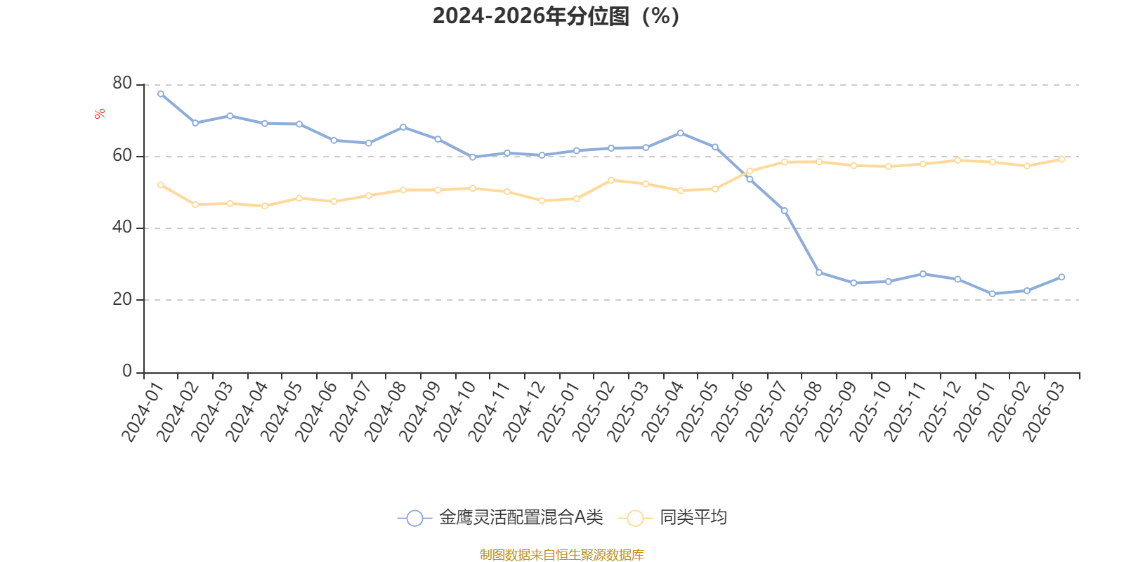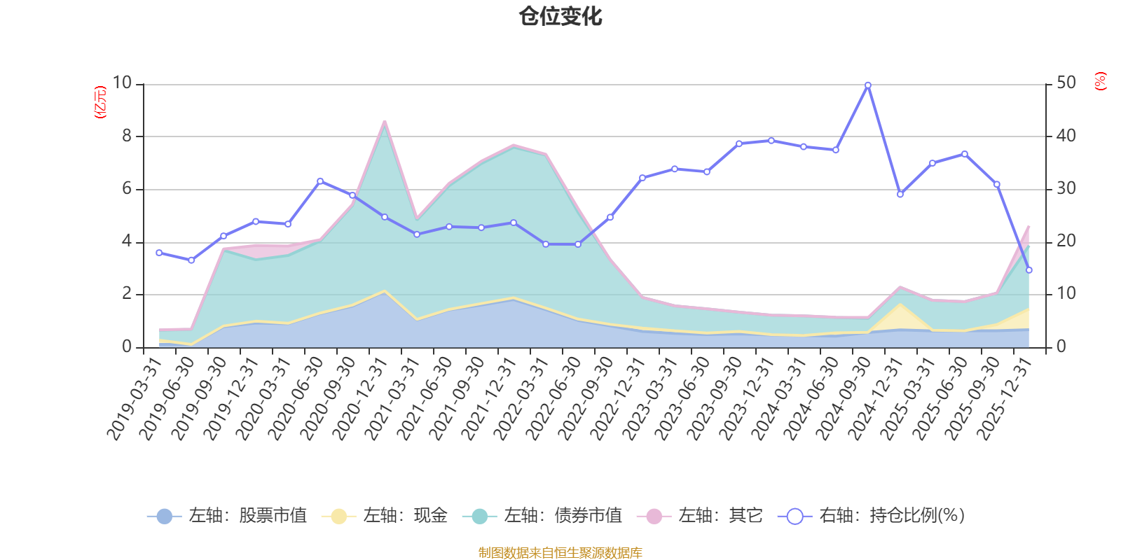 据定期报告数据统计,近三年平均股票仓位为34.75%,同类平均为72.57%。2024年三季度末基金达到49.77%的最高仓位,2025年末最低,为14.7%。