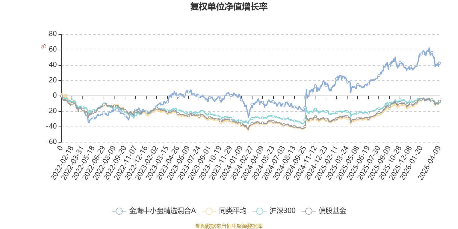 截至4月9日,金鹰中小盘精选混合A近三个月复权单位净值增长率为-3.84%,位于同类可比基金191/265;近半年复权单位净值增长率为-5.66%,位于同类可比基金220/265;近一年复权单位净值增长率为31.87%,位于同类可比基金168/265;近三年复权单位净值增长率为38.17%,位于同类可比基金48/261。