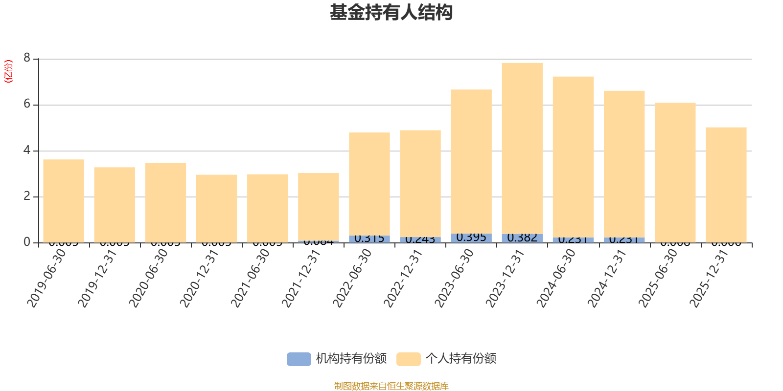 截至2025年12月31日,基金持有人共计2.06万户,合计持有5.01亿份。其中管理人员工持有1.07万份,机构持有份额占比0.12%,个人投资者占比99.88%。