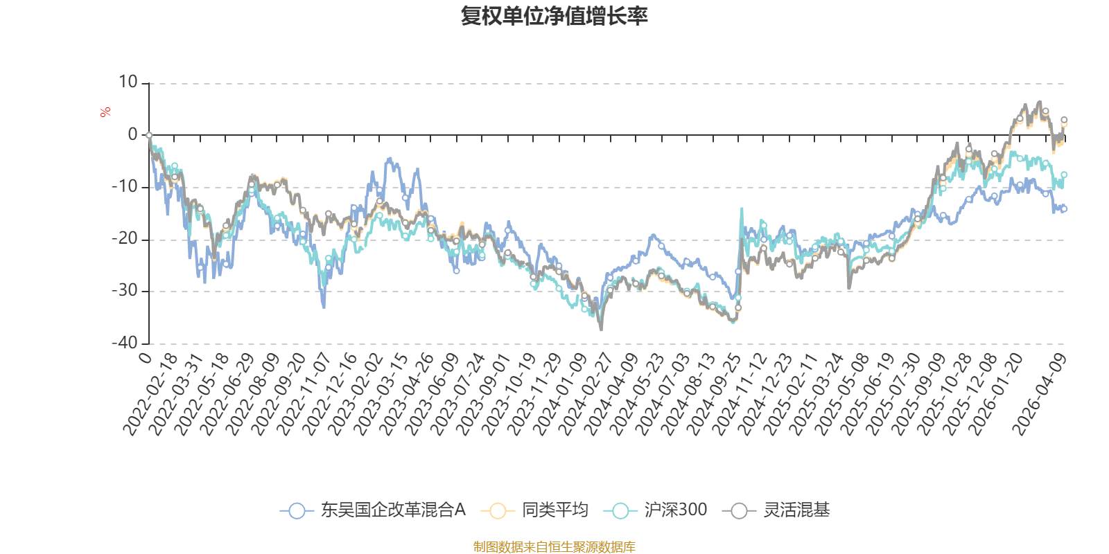 截至4月9日,东吴国企改革混合A近三个月复权单位净值增长率为-5.08%,位于同类可比基金1012/1287;近半年复权单位净值增长率为1.45%,位于同类可比基金669/1286;近一年复权单位净值增长率为10.24%,位于同类可比基金1034/1286;近三年复权单位净值增长率为-5.98%,位于同类可比基金1049/1286。