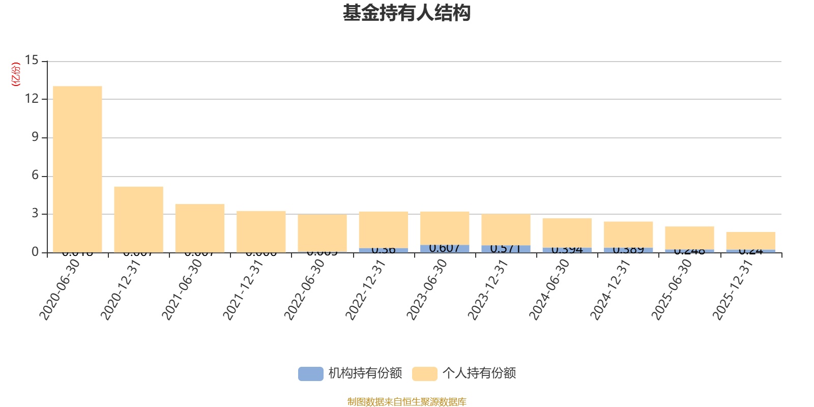 截至2025年12月31日,基金持有人共计1.35万户,合计持有1.61亿份。其中管理人员工持有36.16万份,占比0.22%,机构持有份额占比14.87%,个人投资者占比85.13%。