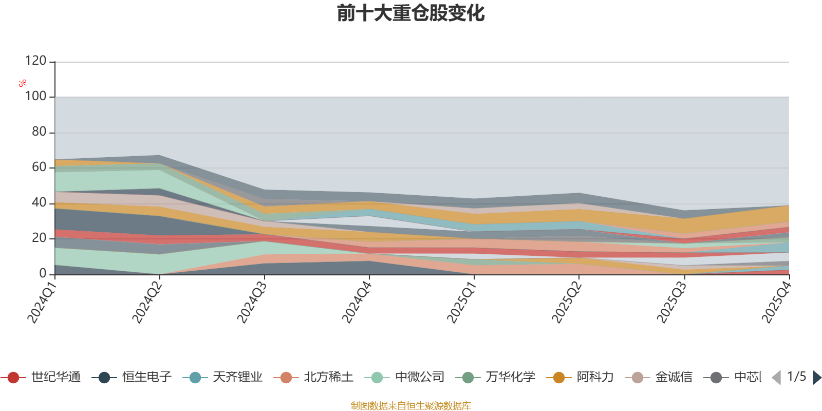 截至2025年末,基金十大重仓股分别是紫金矿业、菲利华、宁德时代、濮耐股份、山金国际、同花顺、博源化工、中芯国际、世纪华通、天齐锂业。