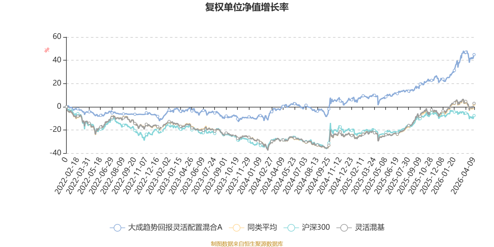 截至4月9日,大成趋势回报灵活配置混合A近三个月复权单位净值增长率为12.84%,位于同类可比基金52/1287;近半年复权单位净值增长率为19.07%,位于同类可比基金82/1286;近一年复权单位净值增长率为40.53%,位于同类可比基金484/1286;近三年复权单位净值增长率为48.84%,位于同类可比基金154/1286。