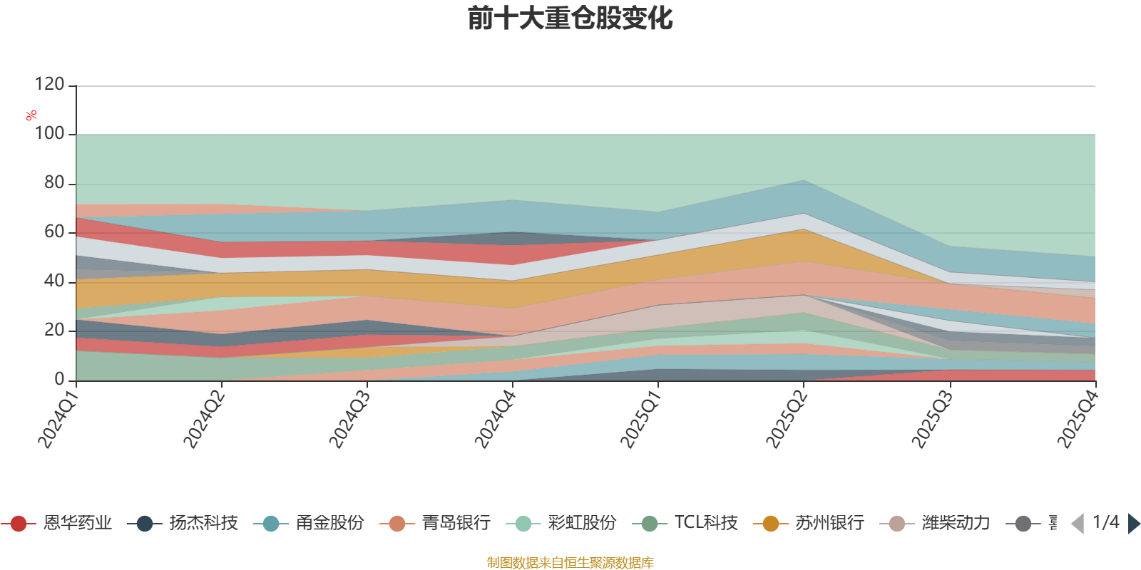 该基金持股集中度较高。截至2025年末,基金十大重仓股分别是渝农商行、齐鲁银行、中国巨石、恩华药业、中国石油、中曼石油、招商轮船、甬金股份、喜临门、TCL科技。