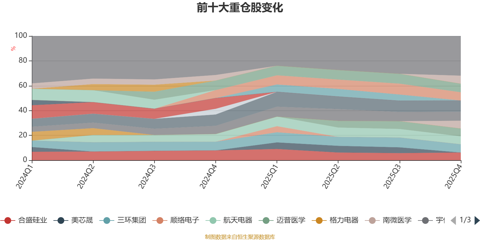 该基金持股集中度较高,近2年前十大重仓股集中度长期超过60%。截至2025年末,基金十大重仓股分别是新大陆、宇信科技、福斯特、通富微电、三环集团、中国中免、航天电器、迈普医学、南微医学、合盛硅业。