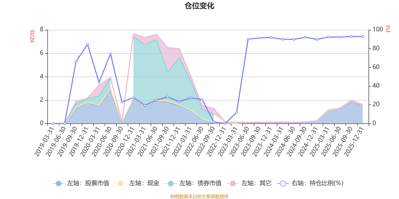 据定期报告数据统计,近三年平均股票仓位为84.77%,同类平均为72.57%。2025年末基金达到92.87%的最高仓位,2022年三季度末最低,为1.69%。