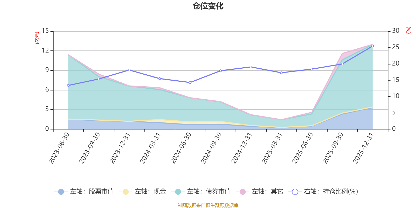 据定期报告数据统计,成立以来平均股票仓位为17.69%,同类平均为19.2%。2025年末基金达到25.45%的最高仓位,2023年上半年末最低,为13.38%。