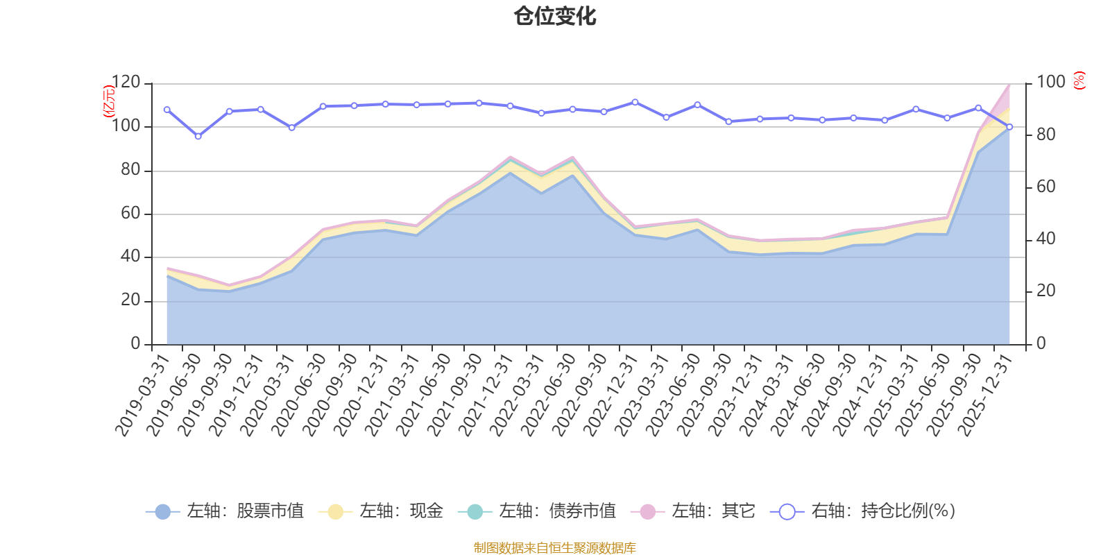 据定期报告数据统计,近三年平均股票仓位为87.18%,同类平均为86.82%。2022年末基金达到92.76%的最高仓位,2019年上半年末最低,为79.69%。