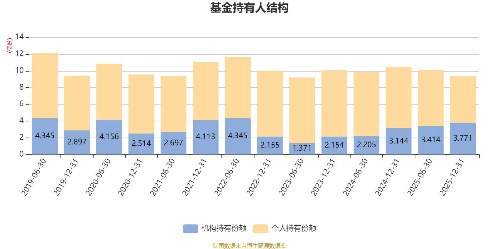 截至2025年12月31日,基金持有人共计14.1万户,合计持有9.35亿份。其中管理人员工持有260.84万份,占比0.28%,机构持有份额占比40.34%,个人投资者占比59.66%。