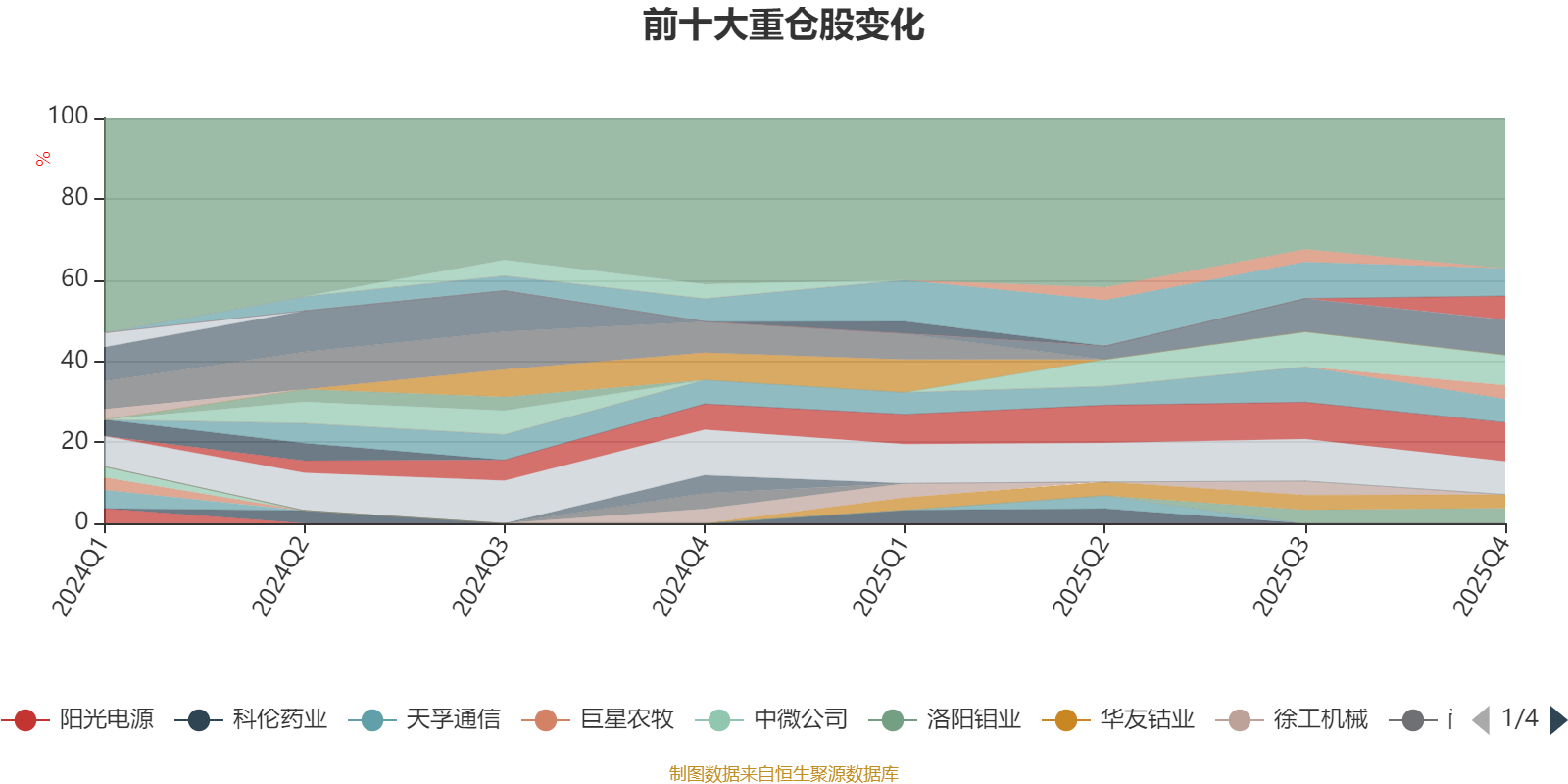 截至2025年末,基金十大重仓股分别是东山精密、中际旭创、宁德时代、新易盛、胜宏科技、天华新能、亿纬锂能、洛阳钼业、华友钴业、天赐材料。
