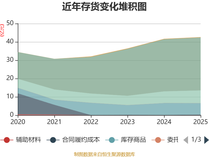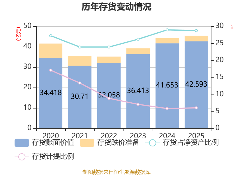 从存货变动来看,截至2025年末,公司存货账面价值为42.59亿元,占净资产的28.72%,较上年末增加9402.48万元。其中,存货跌价准备为2.73亿元,计提比例为6.03%。