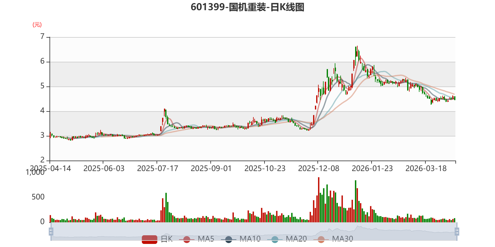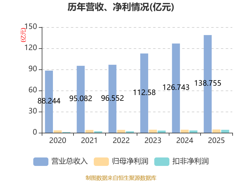 中证智能财讯国机重装(601399)4月14日披露2025年年度报告。2025年,公司实现营业总收入138.75亿元,同比增长9.48%;归母净利润4.64亿元,同比增长7.33%;扣非净利润4.16亿元,同比增长29.48%;经营活动产生的现金流量净额为10亿元,同比下降42.08%;报告期内,国机重装基本每股收益为0.0643元,加权平均净资产收益率为3.17%。