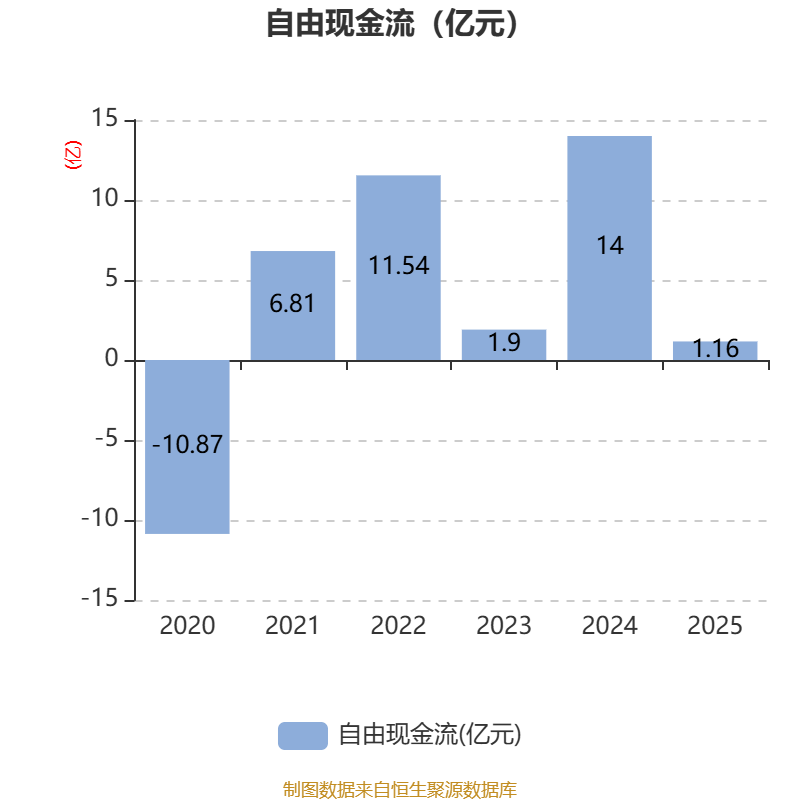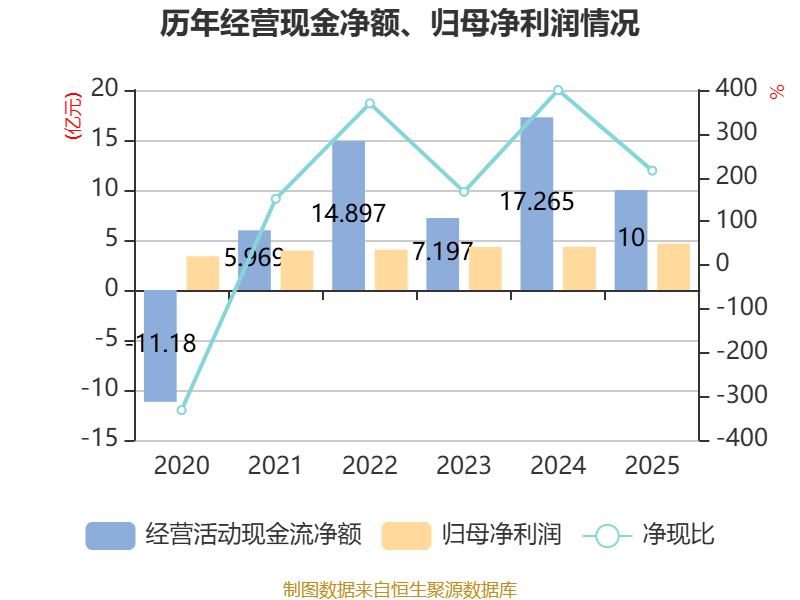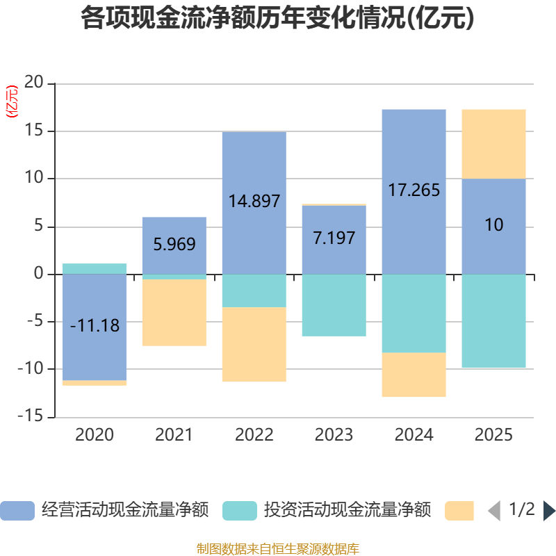 截至2025年,公司经营活动现金流净额为10亿元,同比下降42.08%;筹资活动现金流净额7.26亿元,同比增加11.89亿元;投资活动现金流净额-9.83亿元,上年同期为-8.27亿元。