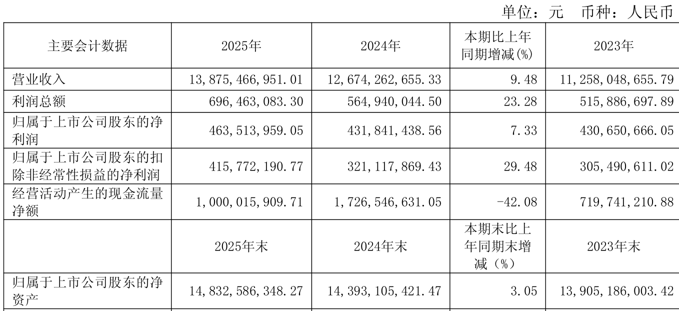 资产重大变化方面,截至2025年末,公司应收票据及应收账款较上年末减少7.4%,占公司总资产比重下降1.61个百分点;应收款项融资较上年末减少48.15%,占公司总资产比重下降1.58个百分点;无形资产较上年末增加11.2%,占公司总资产比重上升1.16个百分点;货币资金较上年末增加7.11%,占公司总资产比重上升1.11个百分点。