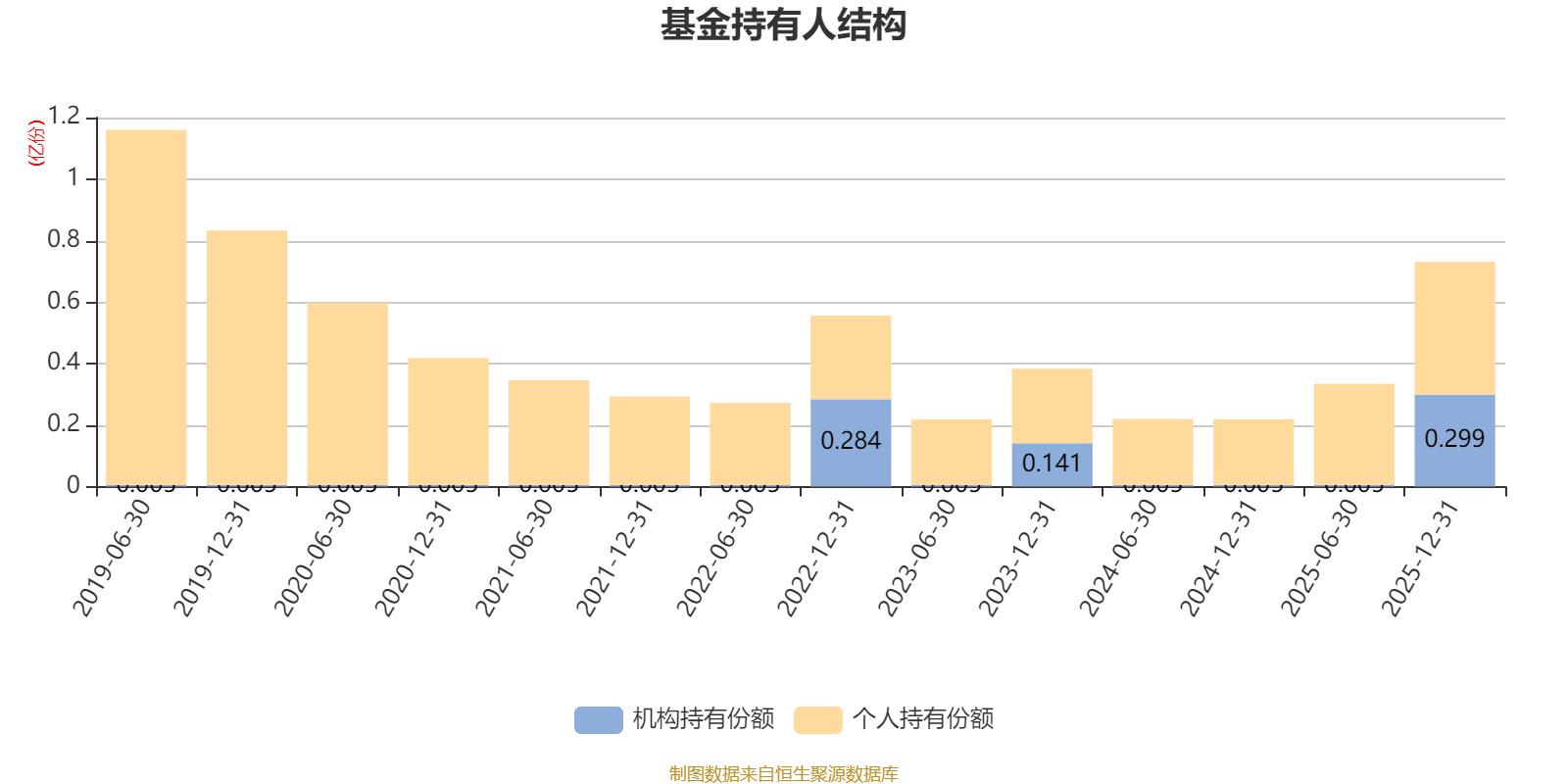 截至2025年12月31日,基金持有人共计3810户,合计持有7305.89万份。其中管理人员工持有52.92万份,占比0.72%,机构持有份额占比40.92%,个人投资者占比59.08%。