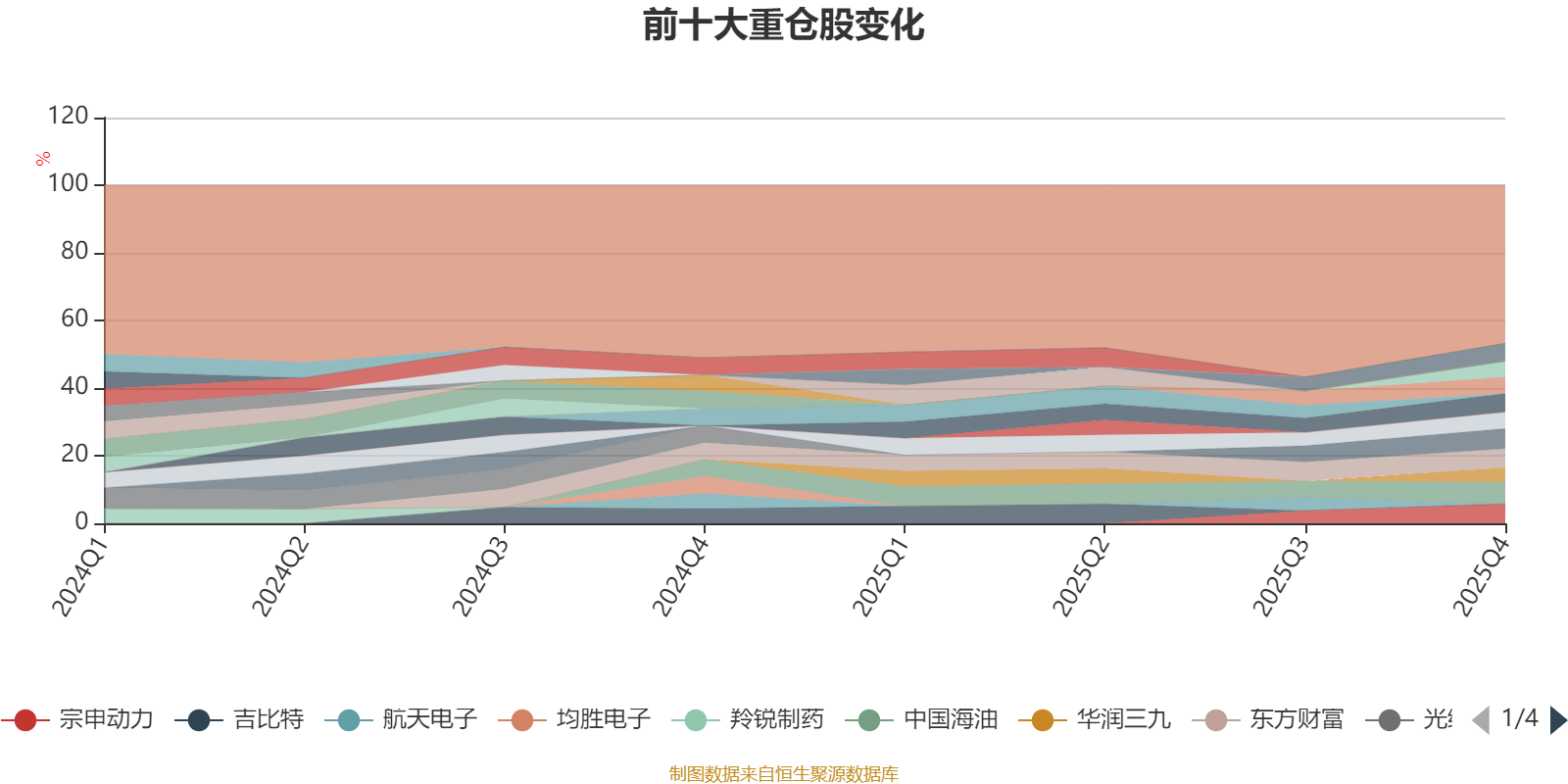 截至2025年末,基金十大重仓股分别是中国海油、双环传动、宗申动力、东方财富、中航沈飞、芒果超媒、航天彩虹、科达利、中国银河、华润三九。