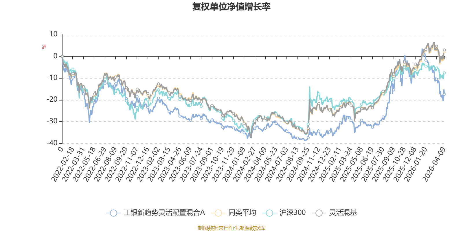截至4月9日,工银新趋势灵活配置混合A近三个月复权单位净值增长率为-17.53%,位于同类可比基金1272/1287;近半年复权单位净值增长率为-15.29%,位于同类可比基金1245/1286;近一年复权单位净值增长率为25.59%,位于同类可比基金764/1286;近三年复权单位净值增长率为7.77%,位于同类可比基金780/1286。