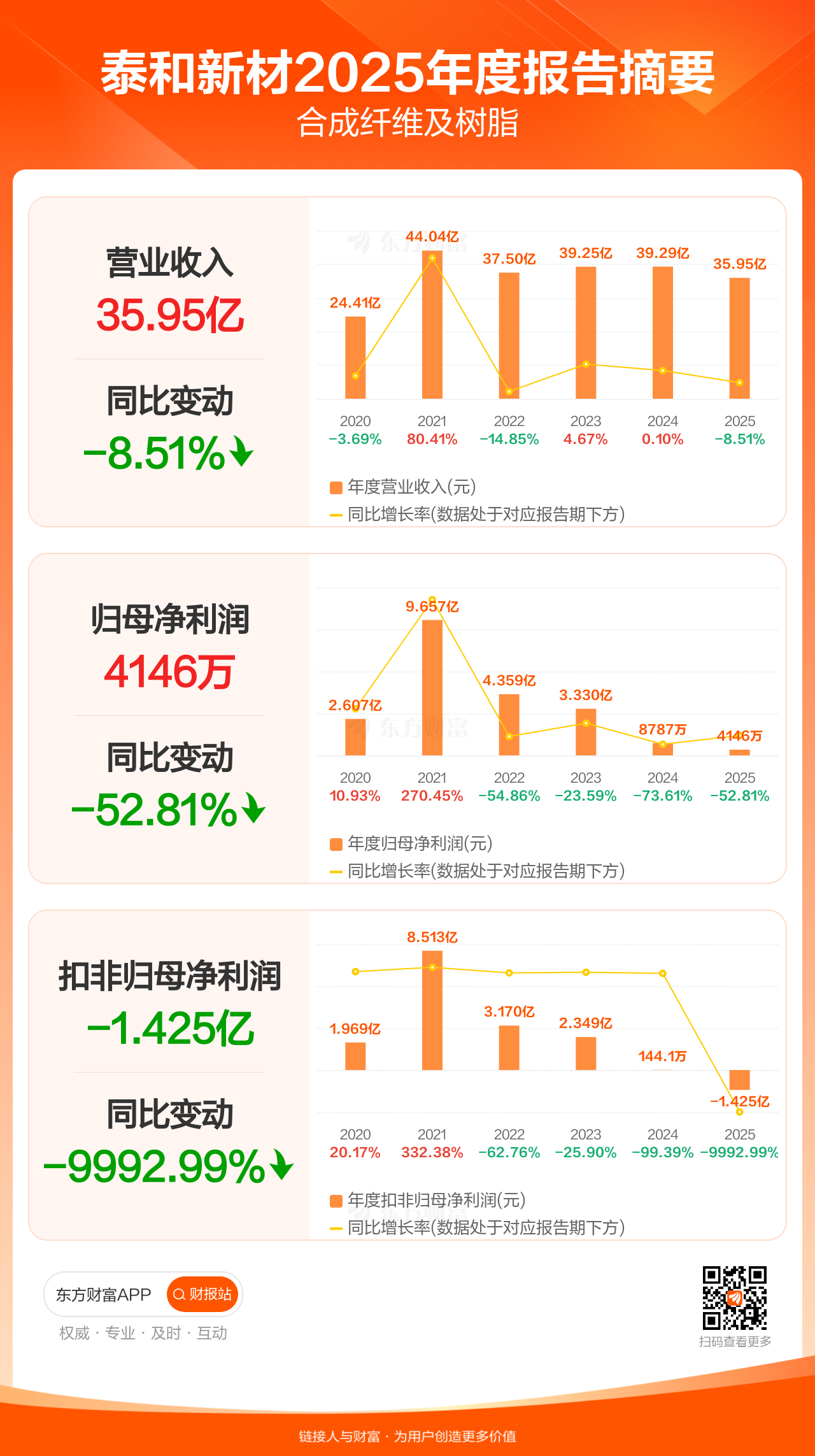 泰和新材4月14日发布2025年年报显示,公司全年实现营业收入35.95亿元,同比下滑8.51%;归母净利润4146.49万元,同比下滑52.81%;扣非归母净利润-1.43亿元。
