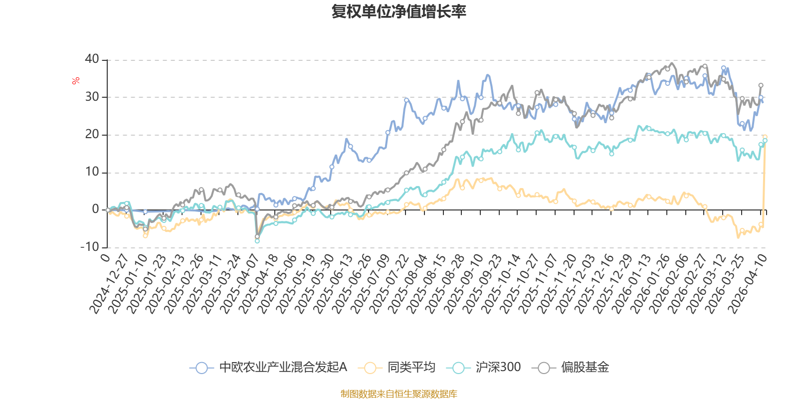 截至4月9日,中欧农业产业混合发起A近三个月复权单位净值增长率为-4.85%,位于同类可比基金12/85;近半年复权单位净值增长率为1.48%,位于同类可比基金4/85;近一年复权单位净值增长率为23.15%,位于同类可比基金4/85。