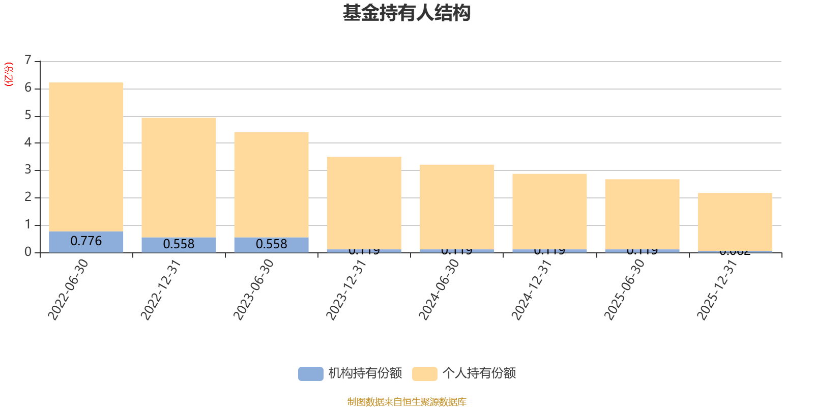 截至2025年12月31日,基金持有人共计1.08万户,合计持有2.18亿份。其中管理人员工持有5.4万份,占比0.02%,机构持有份额占比2.85%,个人投资者占比97.15%。