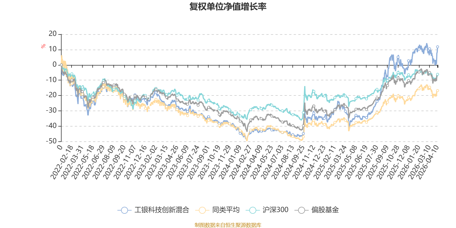 截至4月10日,工银科技创新混合近三个月复权单位净值增长率为0.74%,位于同类可比基金273/621;近半年复权单位净值增长率为9.36%,位于同类可比基金163/621;近一年复权单位净值增长率为82.49%,位于同类可比基金54/618;近三年复权单位净值增长率为46.43%,位于同类可比基金98/559。