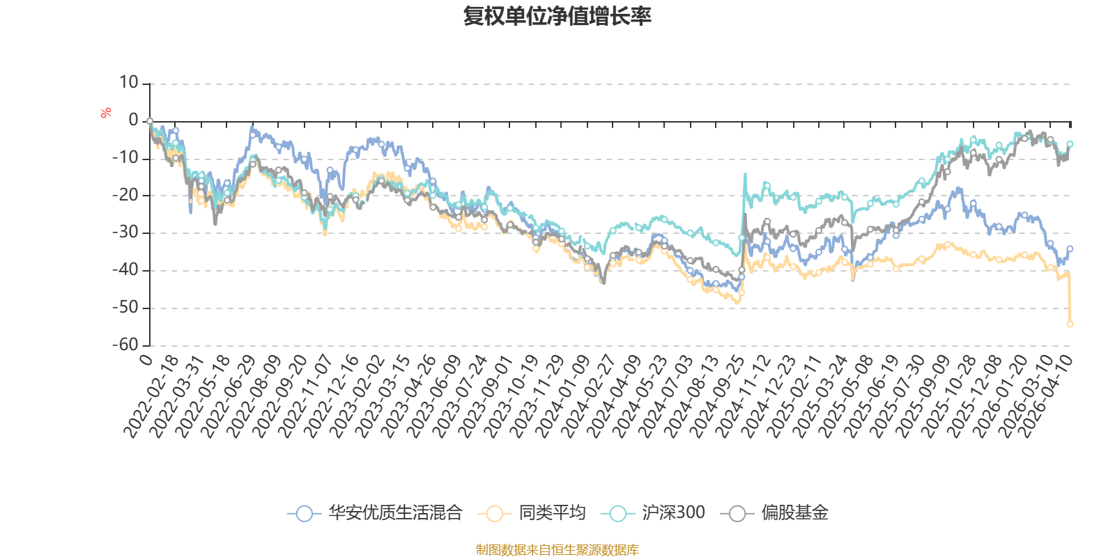 截至4月10日,华安优质生活混合近三个月复权单位净值增长率为-11.67%,位于同类可比基金72/85;近半年复权单位净值增长率为-16.79%,位于同类可比基金72/85;近一年复权单位净值增长率为8.76%,位于同类可比基金14/85;近三年复权单位净值增长率为-26.08%,位于同类可比基金45/76。