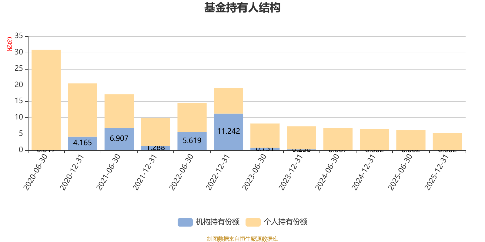 截至2025年12月31日,基金持有人共计2.65万户,合计持有5.26亿份。其中管理人员工持有105.84万份,占比0.20%,机构持有份额占比0.03%,个人投资者占比99.97%。