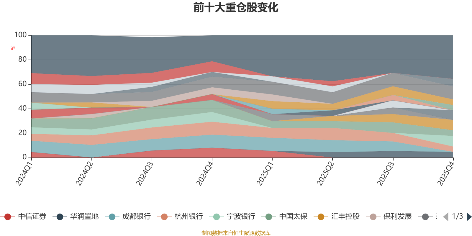 该基金持股集中度较高,近2年前十大重仓股集中度长期超过60%。截至2025年末,基金十大重仓股分别是招商银行、宁波银行、汇丰控股、中国平安、中国人寿、中国太保、华润置地、香港交易所、杭州银行、渣打集团。
