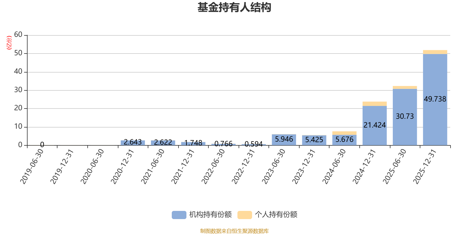 截至2025年12月31日,基金持有人共计1.18万户,合计持有51.85亿份。其中管理人员工持有292.09万份,占比0.06%,机构持有份额占比95.93%,个人投资者占比4.07%。