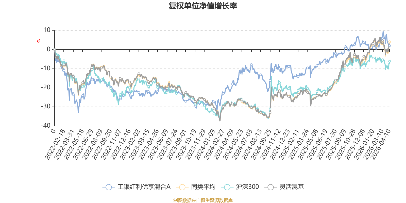 截至4月10日,工银红利优享混合A近三个月复权单位净值增长率为1.59%,位于同类可比基金426/1287;近半年复权单位净值增长率为-0.14%,位于同类可比基金928/1286;近一年复权单位净值增长率为16.07%,位于同类可比基金928/1286;近三年复权单位净值增长率为33.62%,位于同类可比基金318/1286。