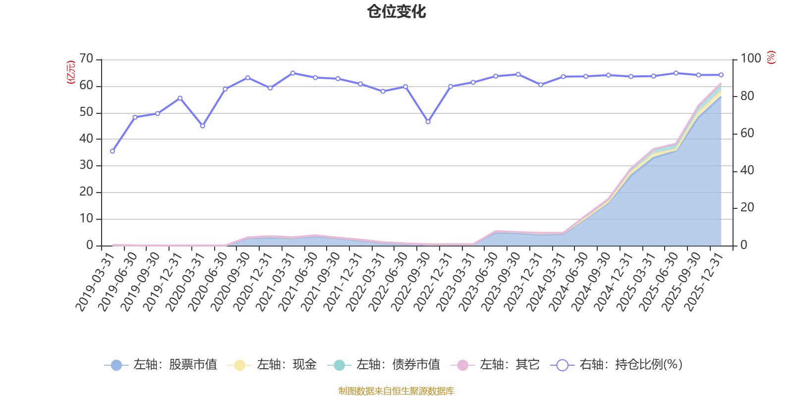 据定期报告数据统计,近三年平均股票仓位为90.68%,同类平均为72.57%。2025年上半年末基金达到92.66%的最高仓位,2019年一季度末最低,为50.76%。
