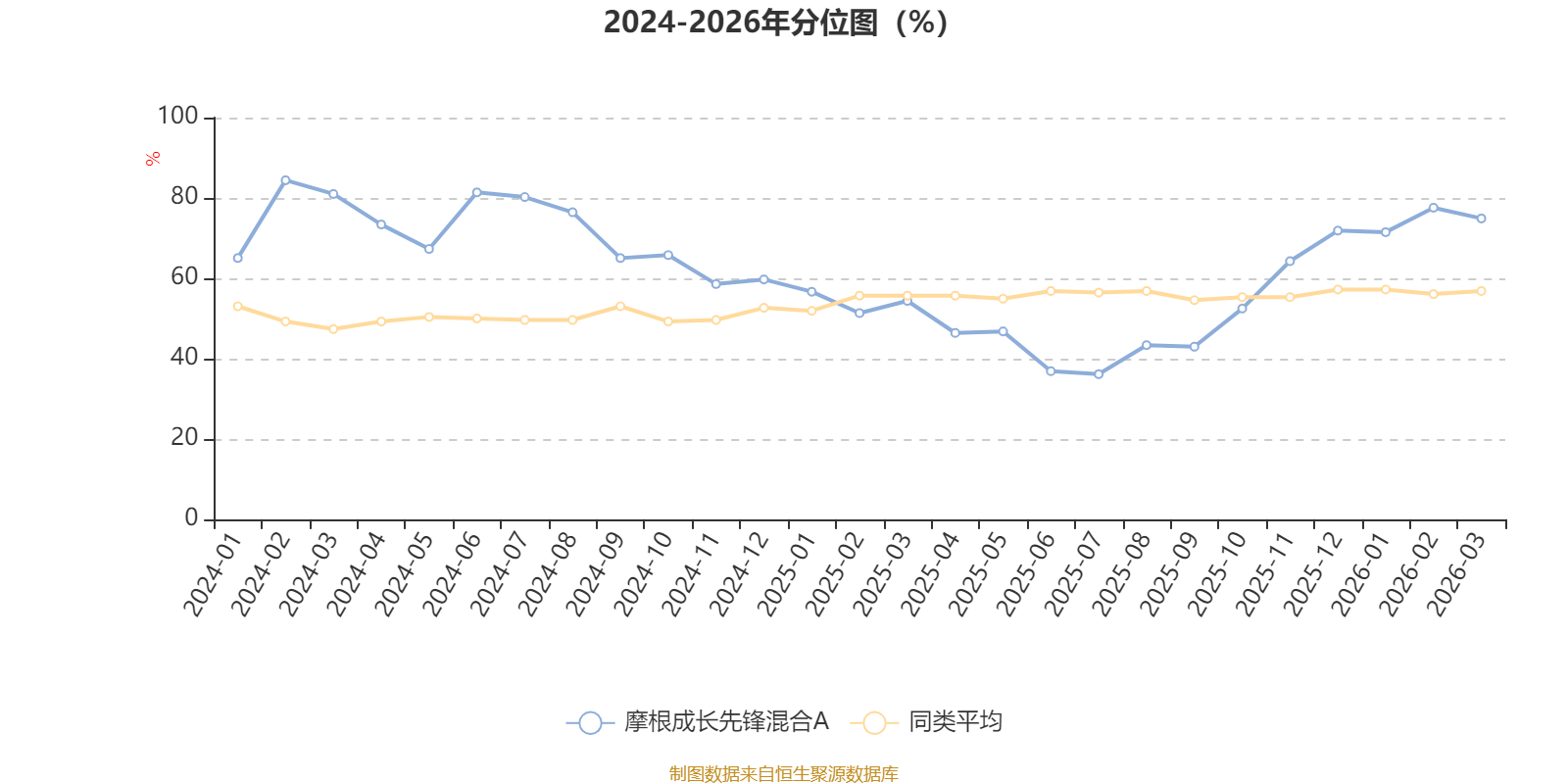 通过所选区间该基金净值增长率分位图,可以观察该基金与同类基金业绩比较情况。图为坐标原点到区间内某时点的净值增长率在同类基金中的分位数。
