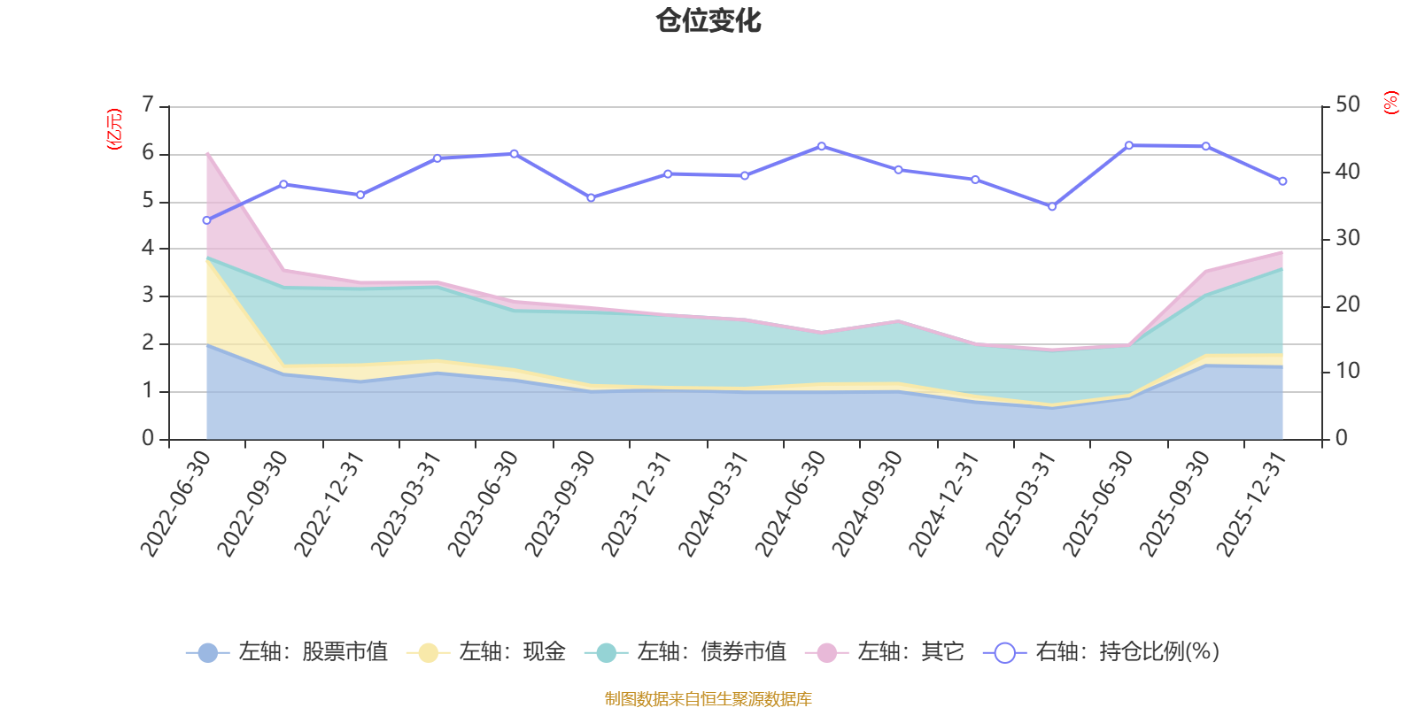 据定期报告数据统计,近三年平均股票仓位为40.5%,同类平均为19.2%。2025年上半年末基金达到44.13%的最高仓位,2022年上半年末最低,为32.88%。