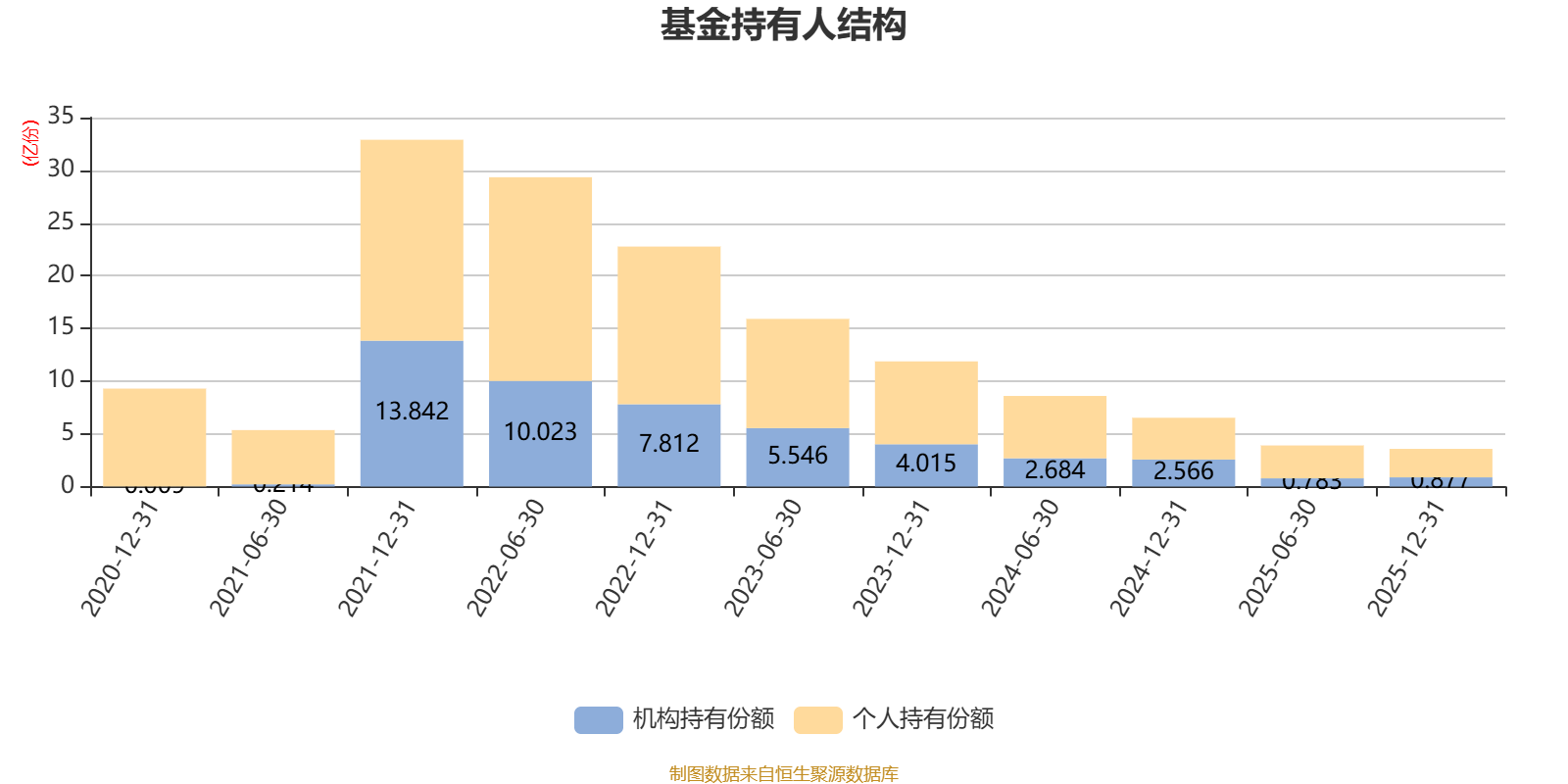 截至2025年12月31日,基金持有人共计2.59万户,合计持有3.58亿份。其中管理人员工持有128.91万份,占比0.36%,机构持有份额占比24.52%,个人投资者占比75.48%。